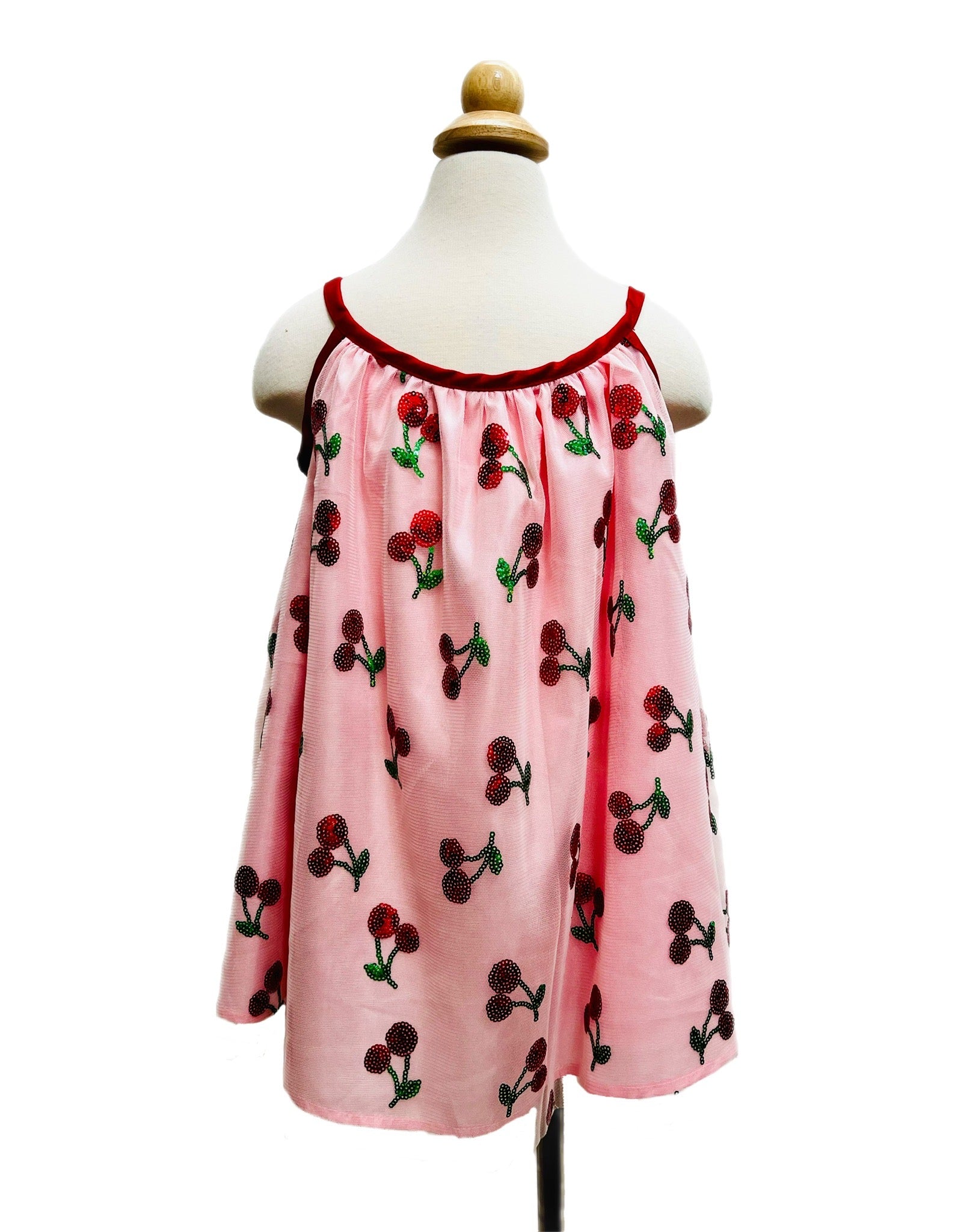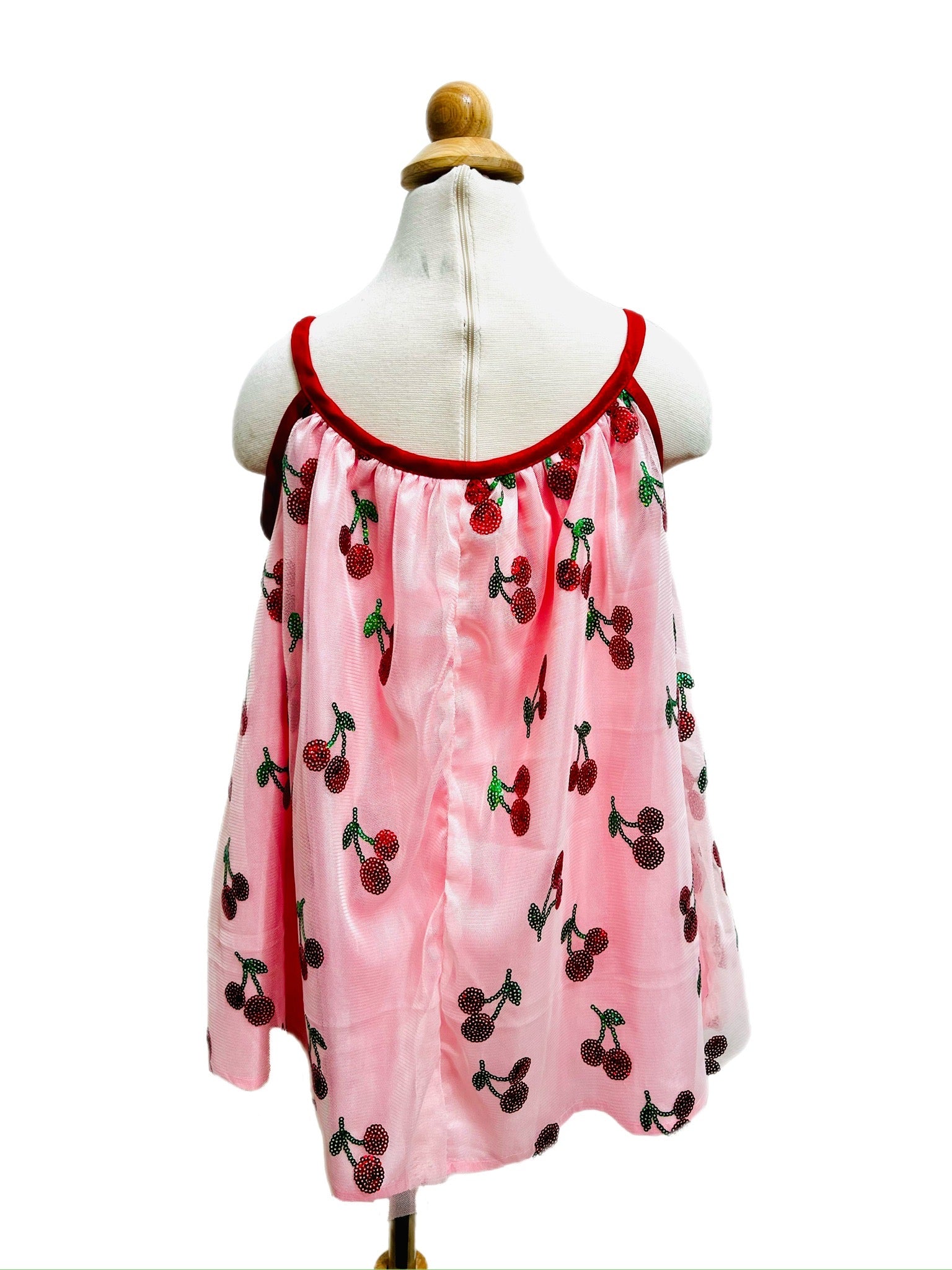 Let her sparkle into spring and summer with our Cherry Sweet Sequin Mesh Girls Top. This standout piece features a playful mesh overlay sprinkled with shimmering sequin cherry clusters that catch the light just right. Underneath, a soft and breathable pink lining keeps things comfy for all-day wear—no itching, no fuss, just sweet style.