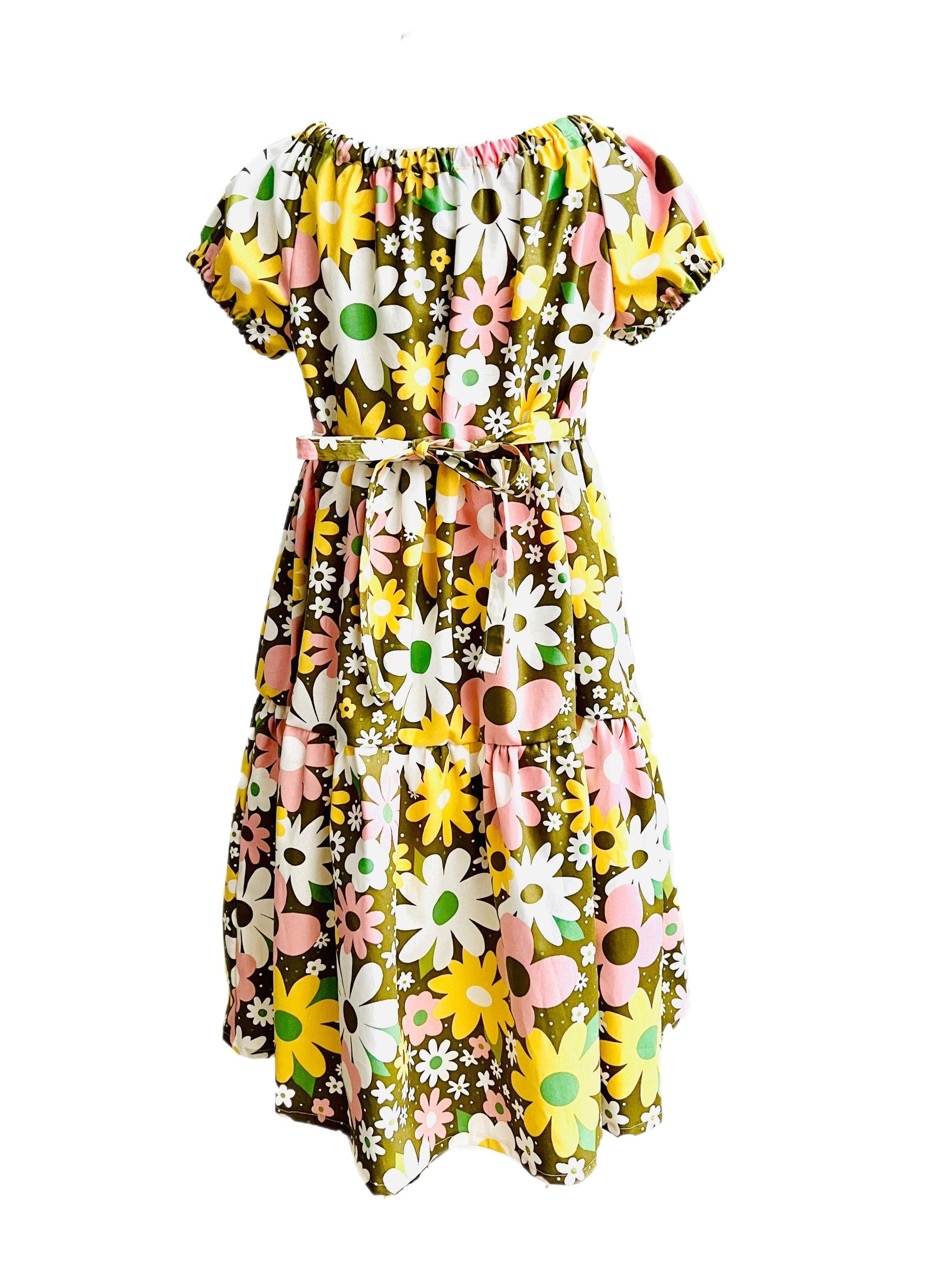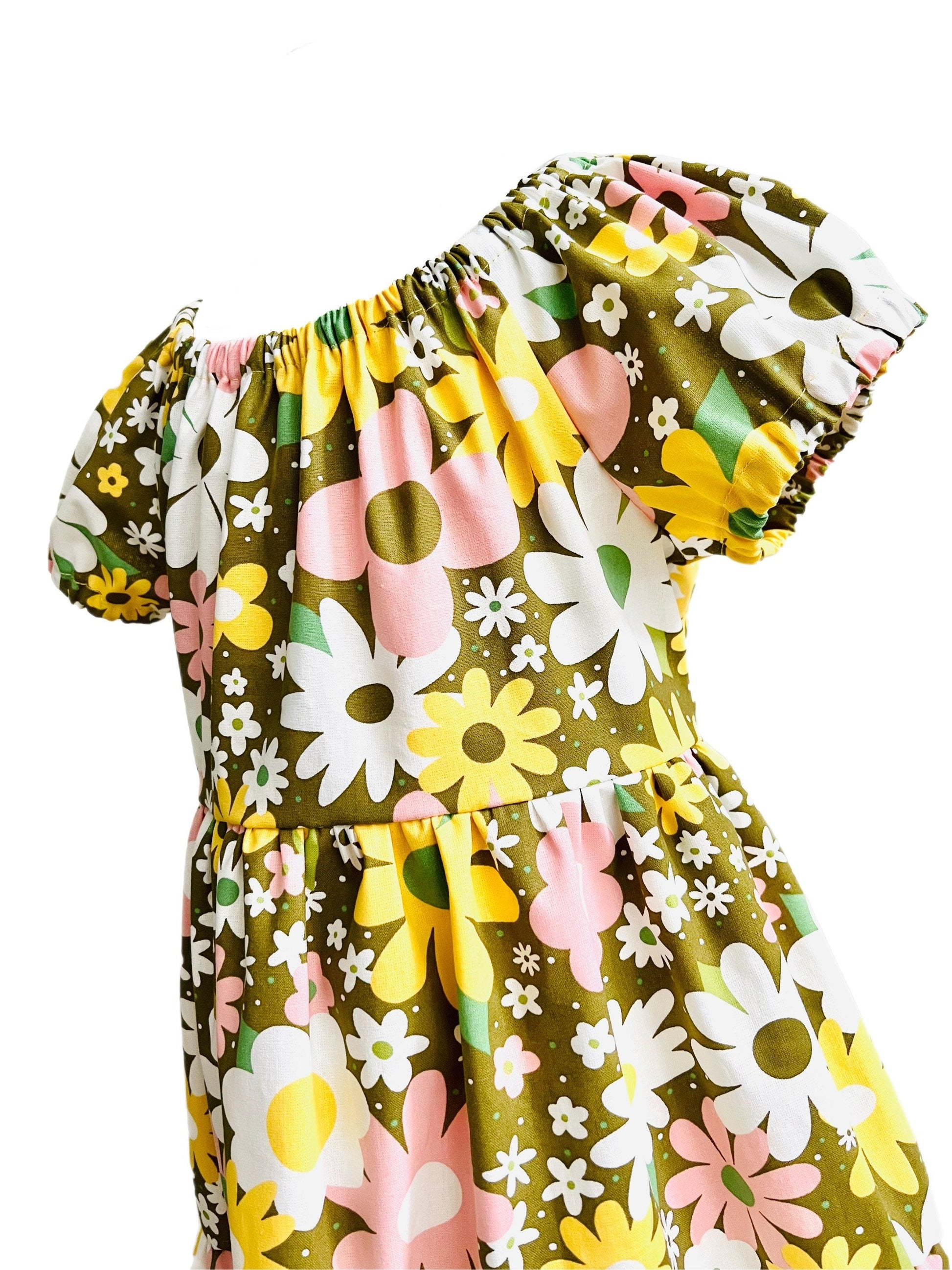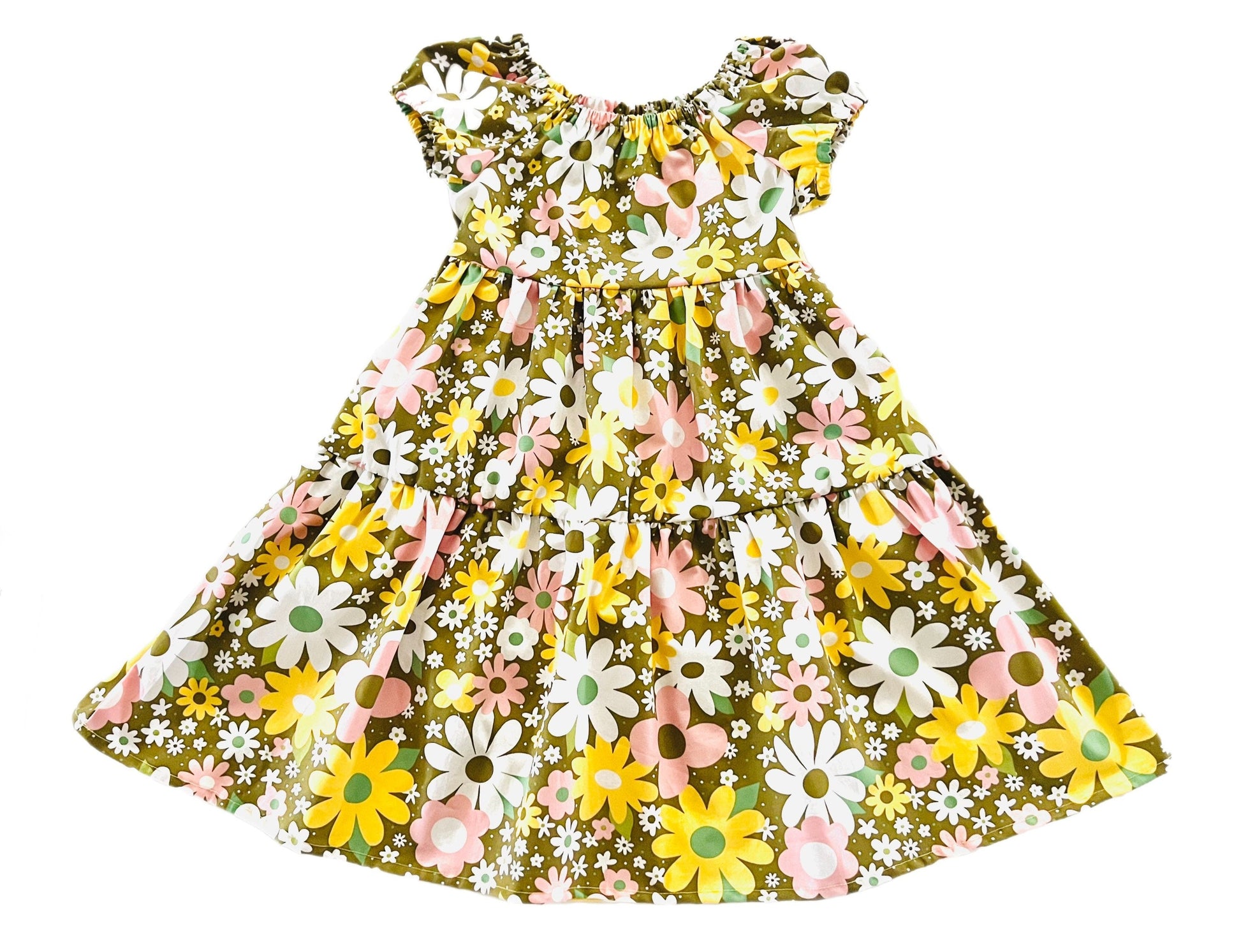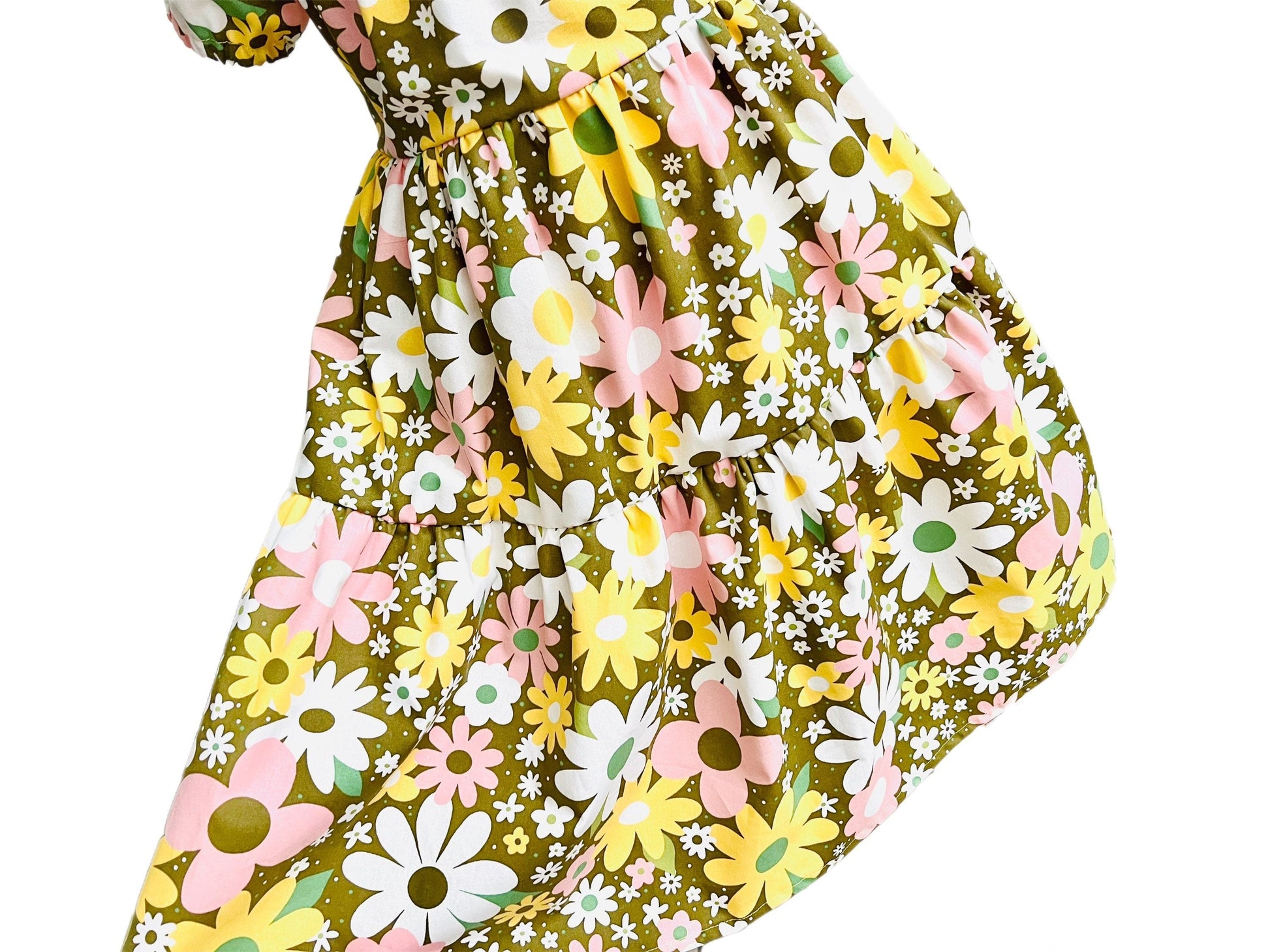 100% cotton hand sewn dress with gathered layered tiers including gathered neckline, this particular dress is adjustable and custom to any child with any type of size. If you have any other questions please message me .