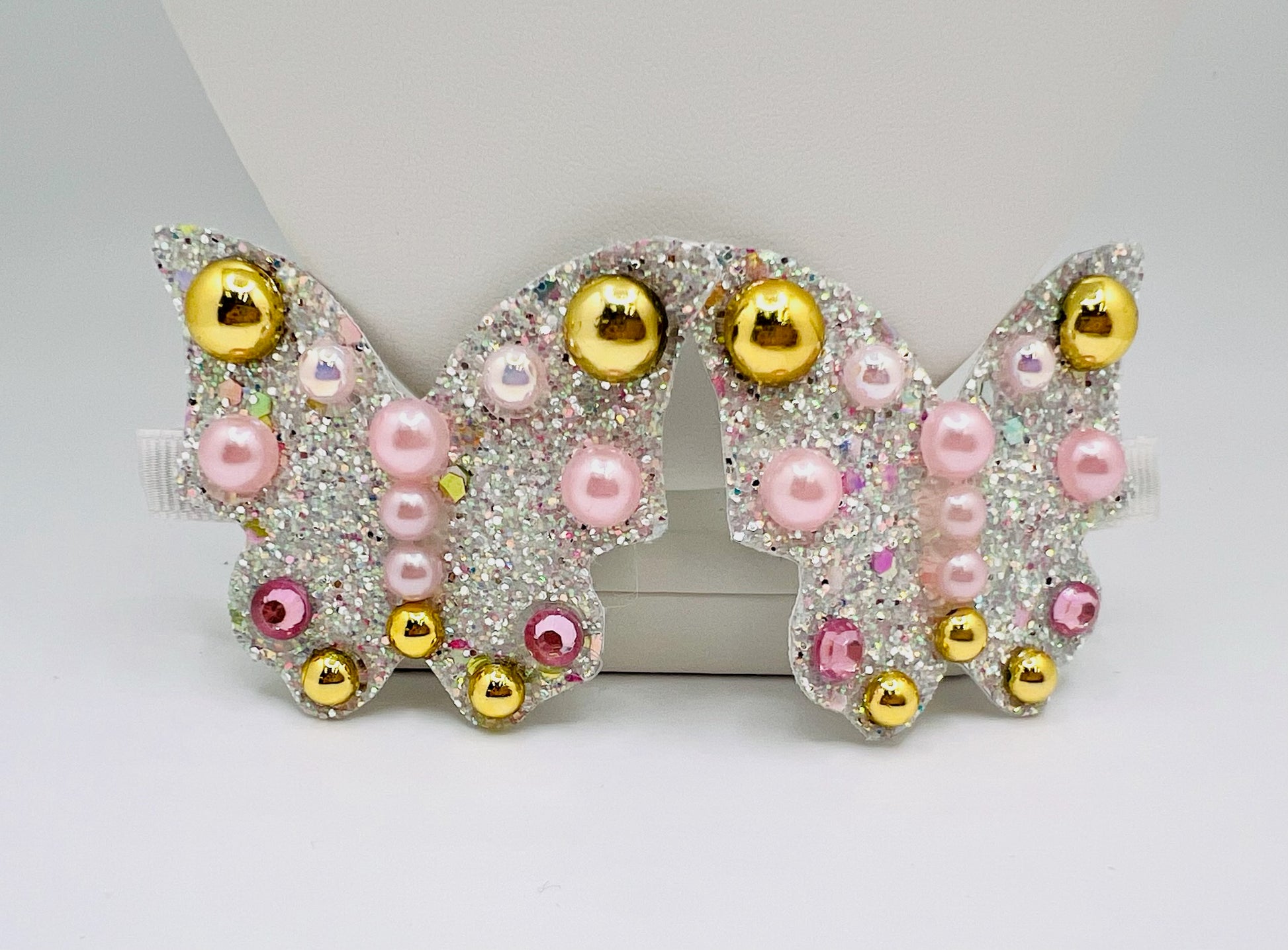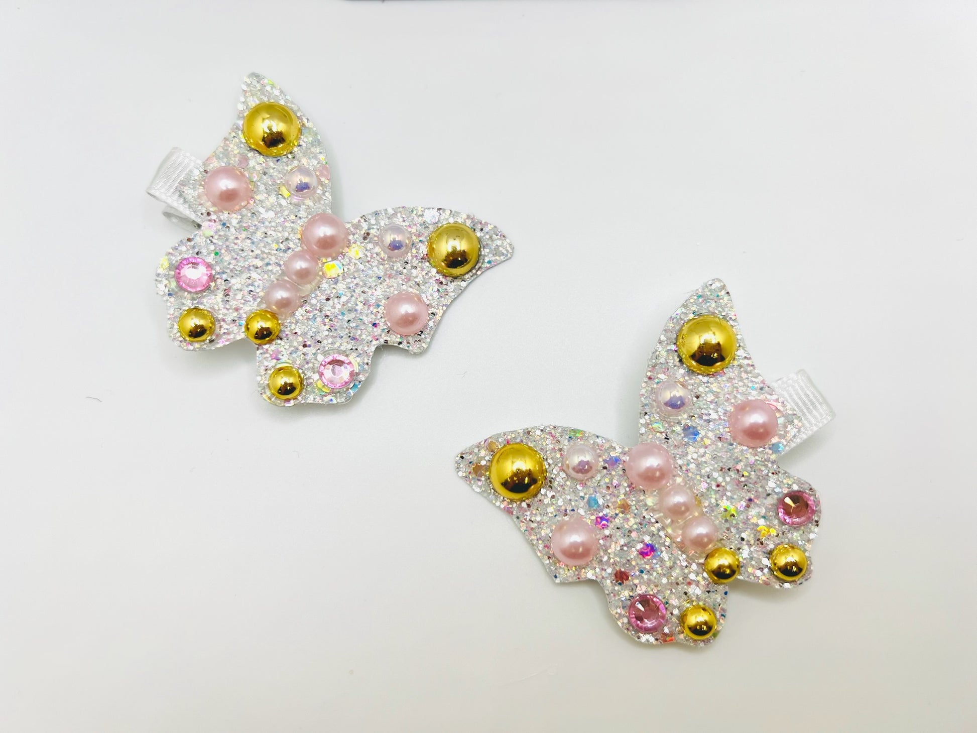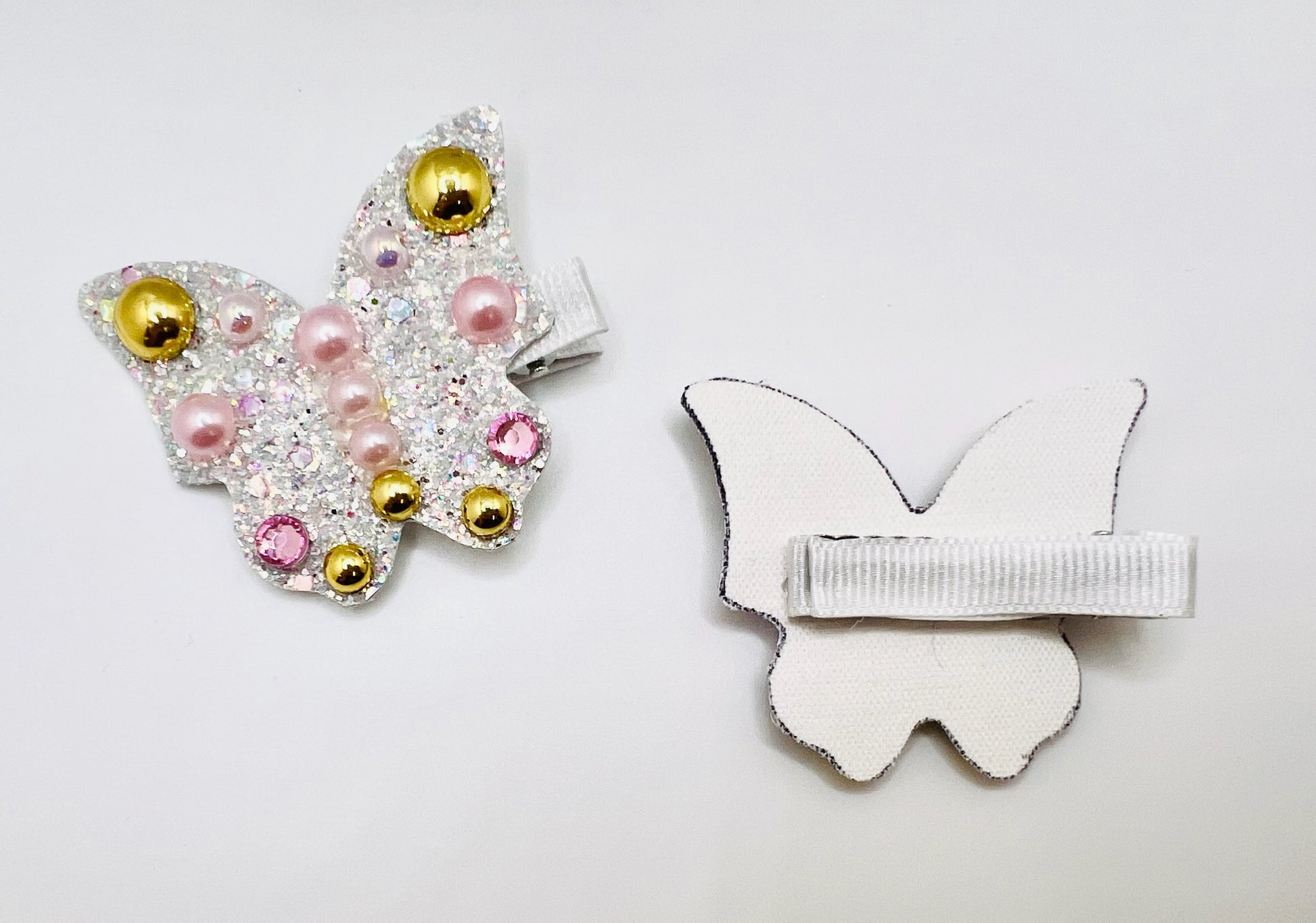 Transform any hairstyle with our enchanting Girls' Butterfly Hair Clip, beautifully crafted from chunky glitter scrapbook paper and embellished with hot-fix crystals and pearls. This dazzling accessory brings a touch of magic and elegance to everyday looks or special occasions.