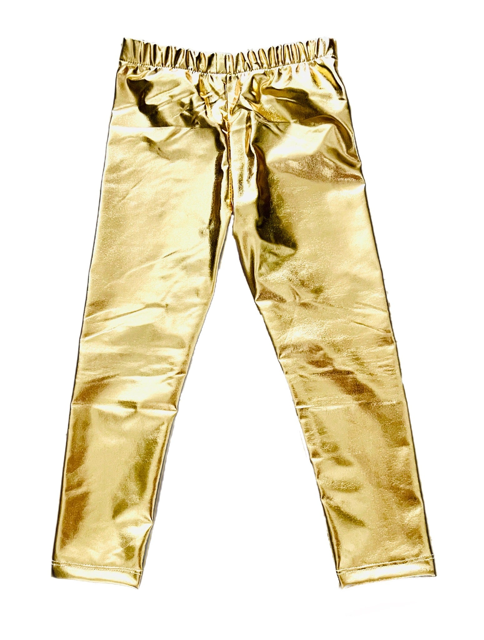 Let her shine bright with these eye-catching metallic gold leggings! Designed to add sparkle to any outfit, these leggings are crafted from a stretchy, comfortable fabric that provides a snug fit and freedom of movement. The shimmery gold finish makes them perfect for holiday parties, special occasions, or simply adding a pop of glam to her everyday look. Pair them with dresses, tops, or cozy sweaters for a style that stands out. These leggings are sure to become a favorite piece in her wardrobe, bringing bold style to any ensemble!