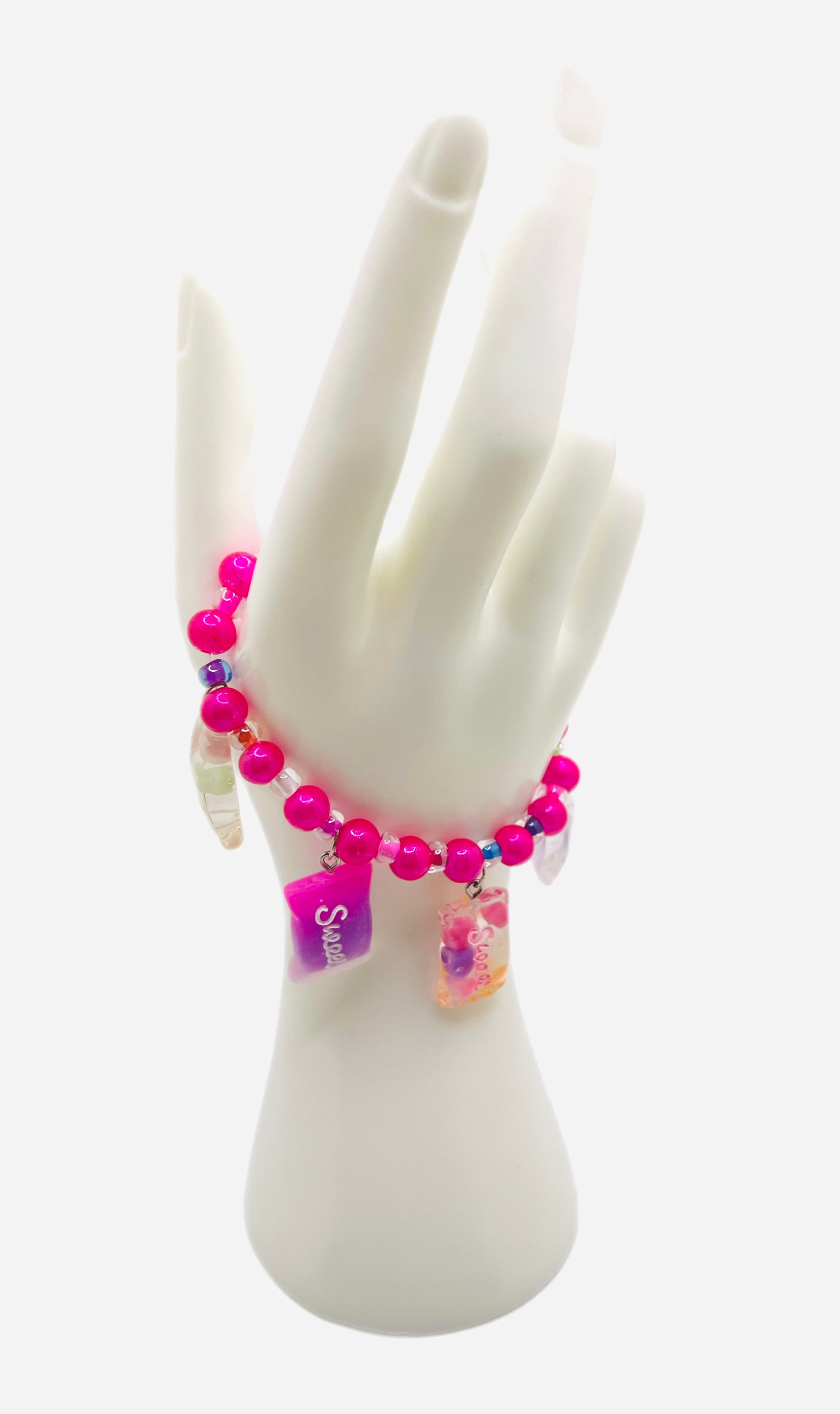 These are handmade, hand crafted beaded bracelet with bright hot pink beads and pearls, with cute little candy charms attached with the bracelet. This bracelet is for all ages, weather your a child who loves to play and be fashionable and have fun or a adult who loves cute and fun things! This fashion accessory will bring joy to you, especially for gifts !