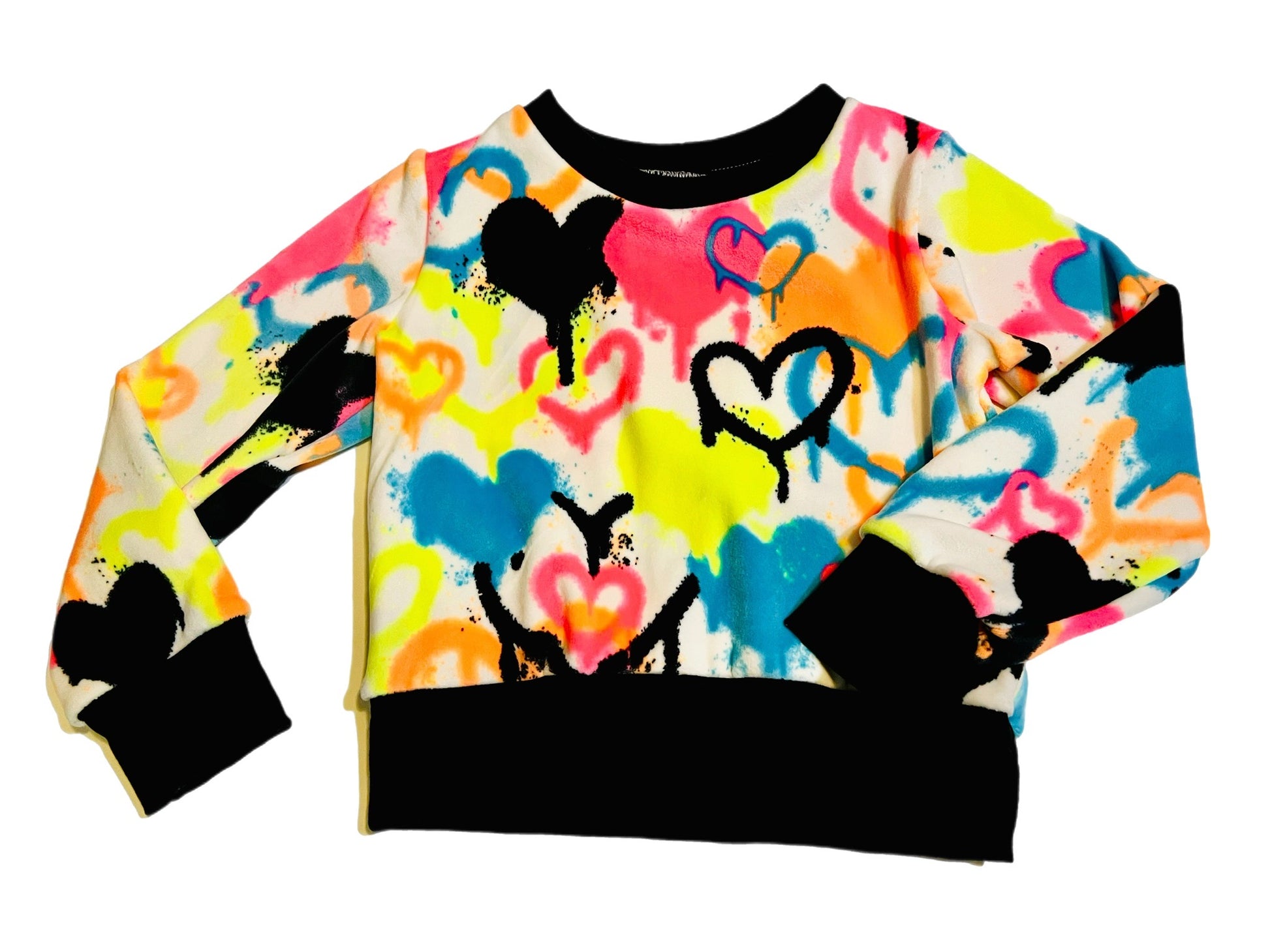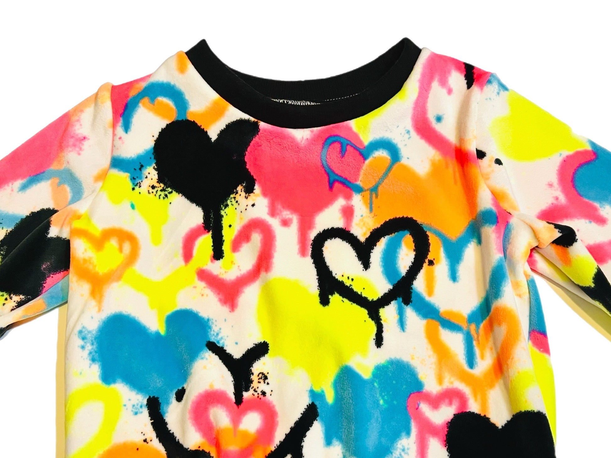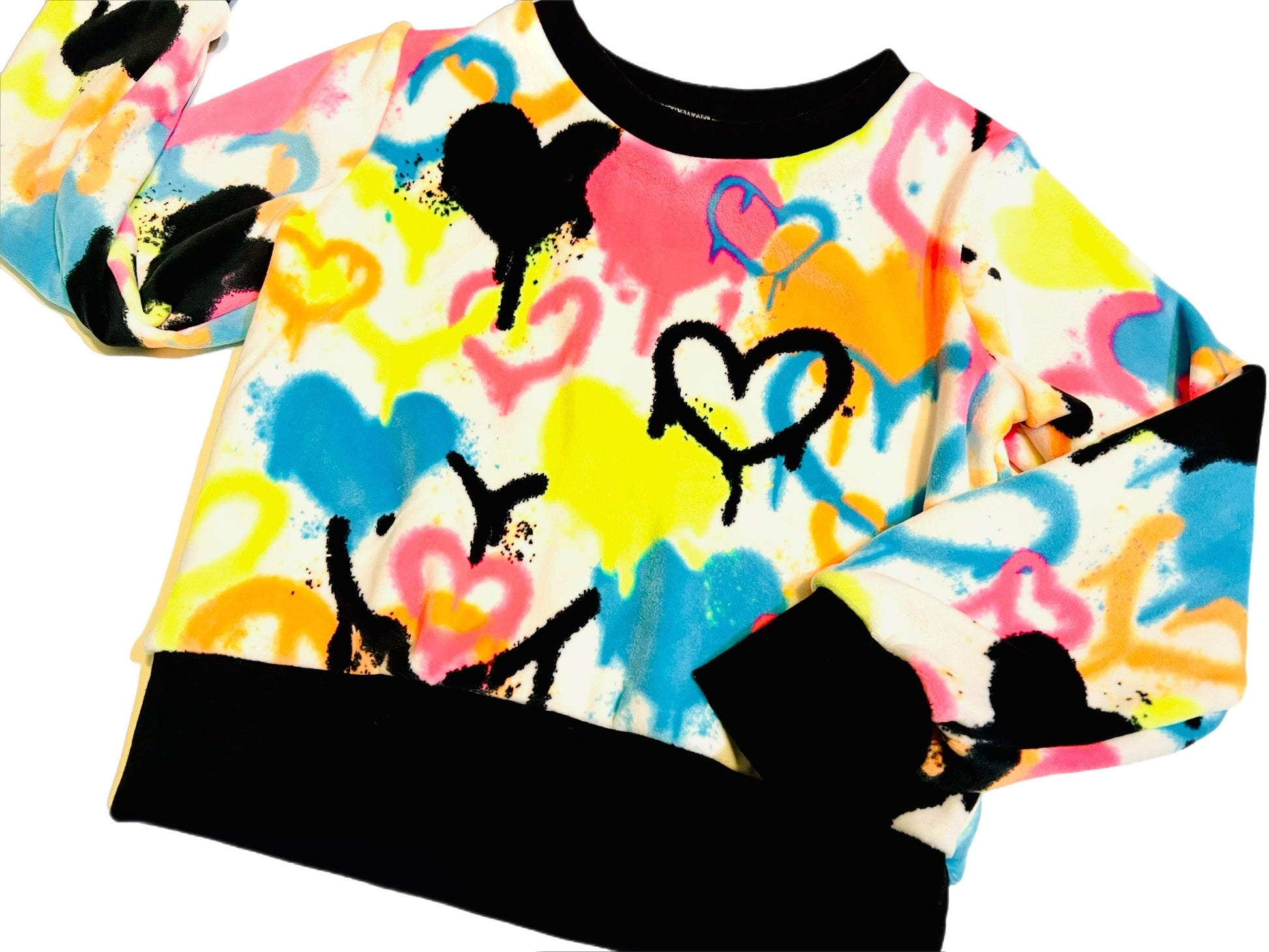 Brighten up her wardrobe with this cozy fleece top featuring a bold graffiti-inspired neon hearts print! Bursting with vibrant colors and artistic flair, this top adds a playful, trendy vibe to her cold-weather looks.