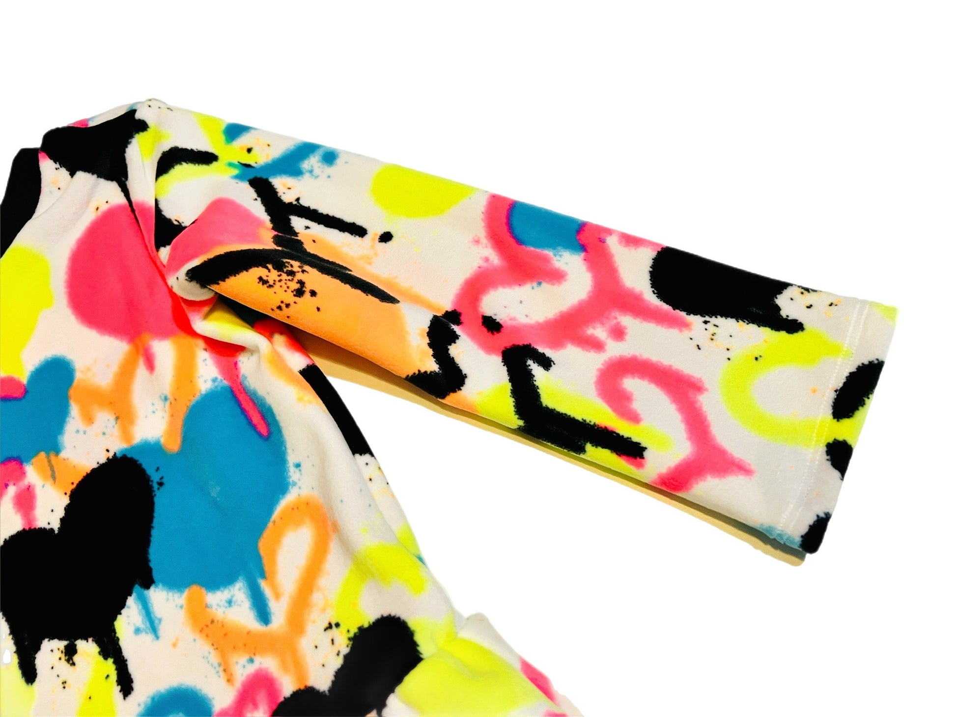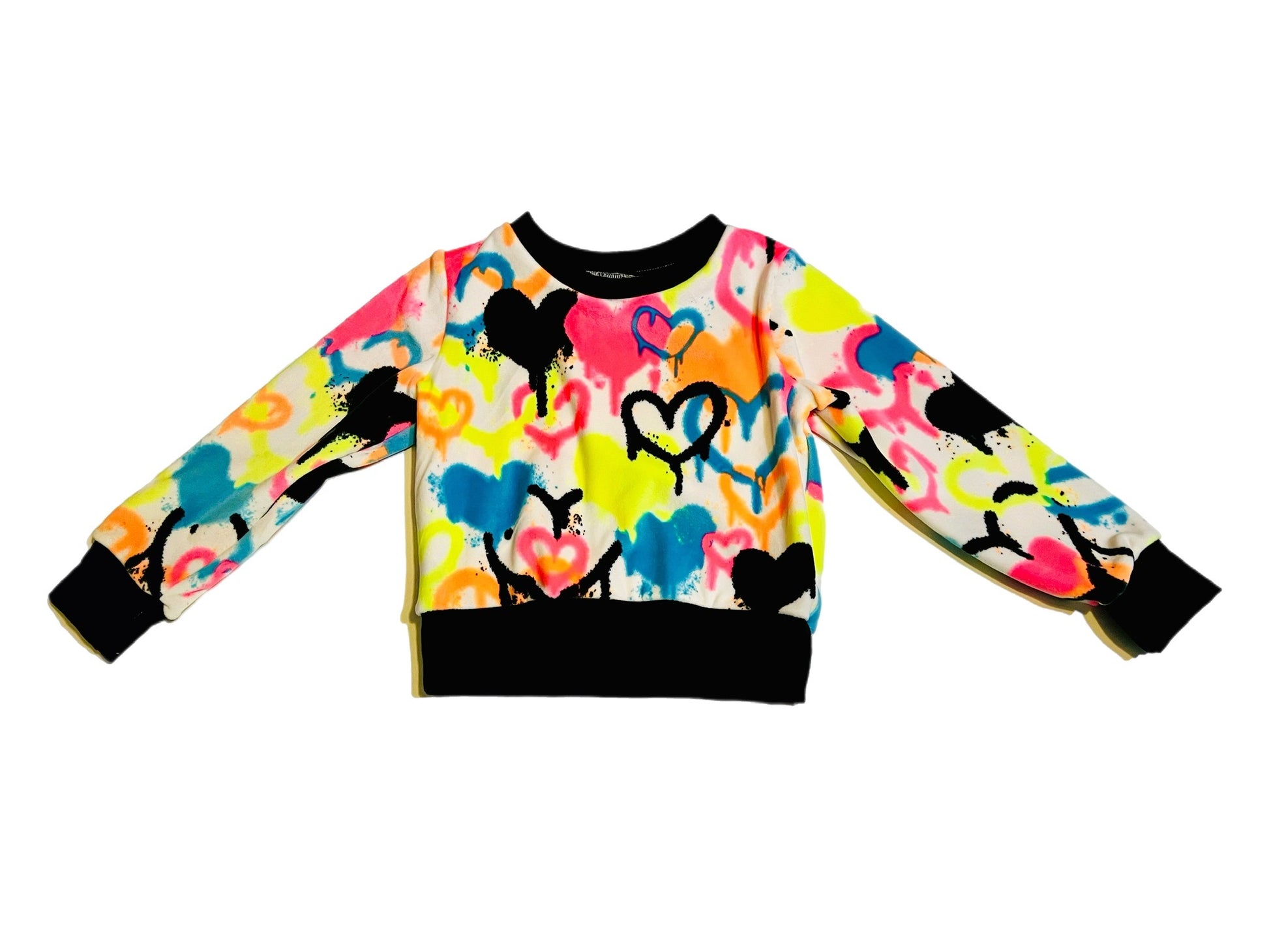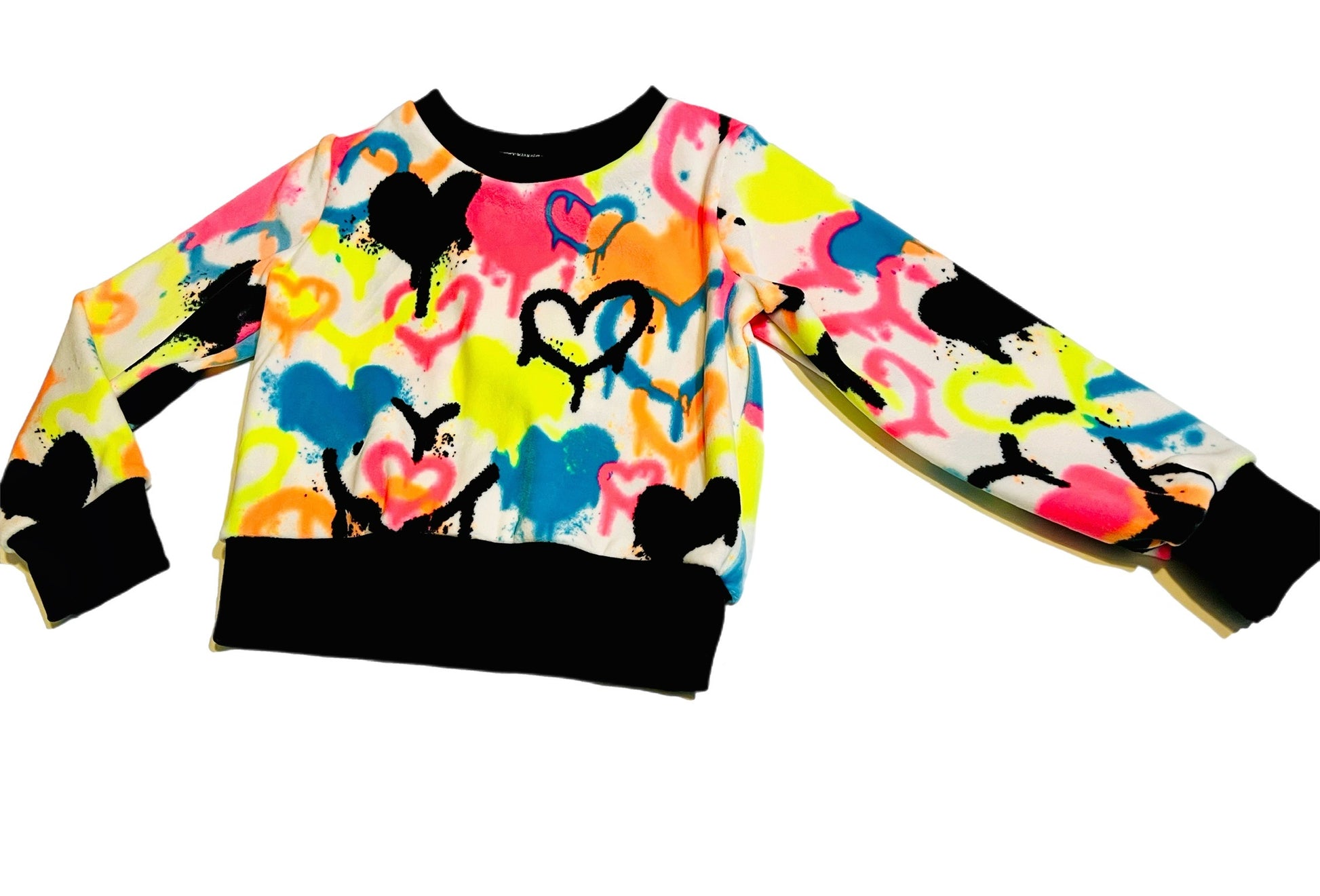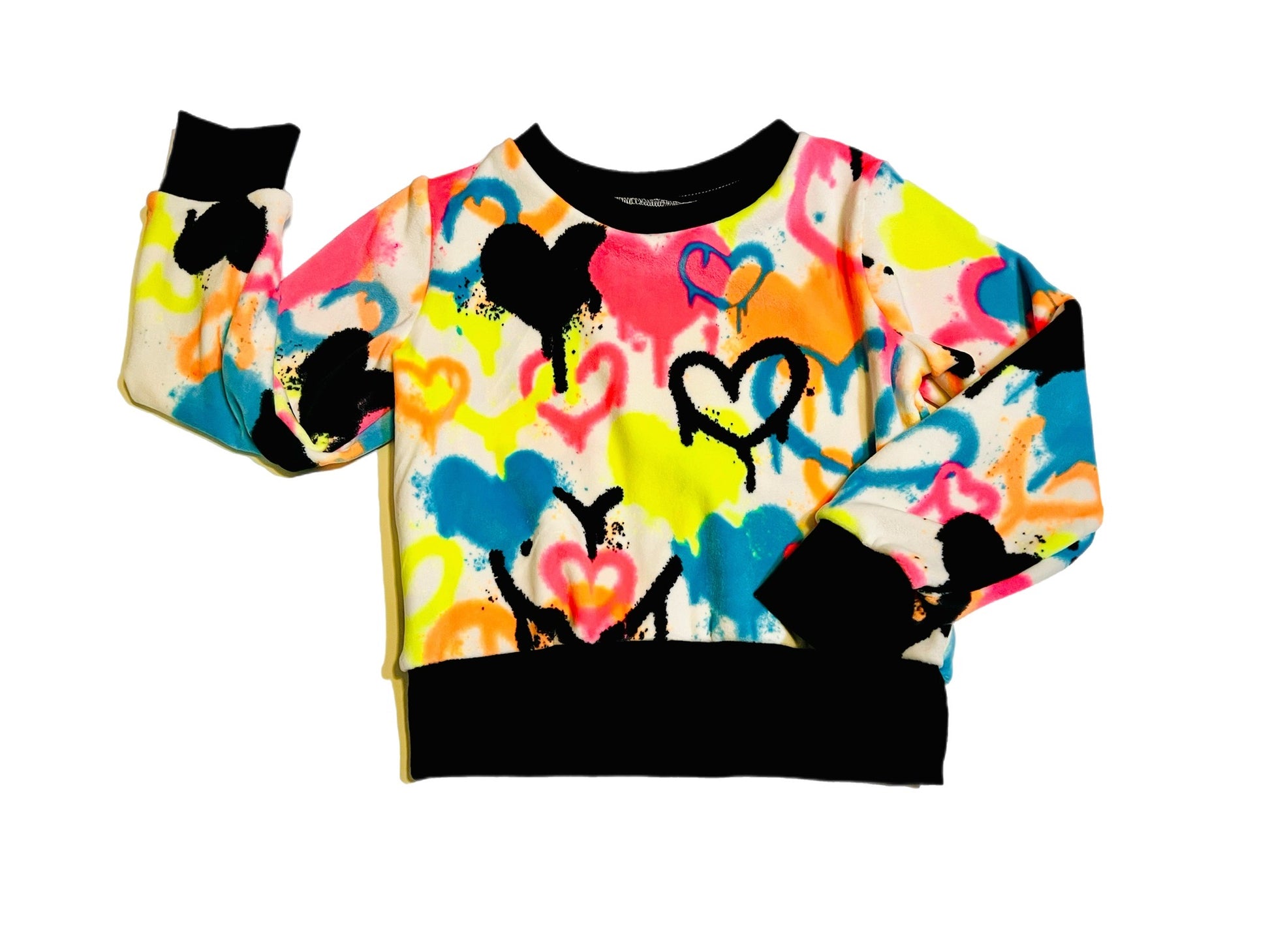 Brighten up her wardrobe with this cozy fleece top featuring a bold graffiti-inspired neon hearts print! Bursting with vibrant colors and artistic flair, this top adds a playful, trendy vibe to her cold-weather looks.